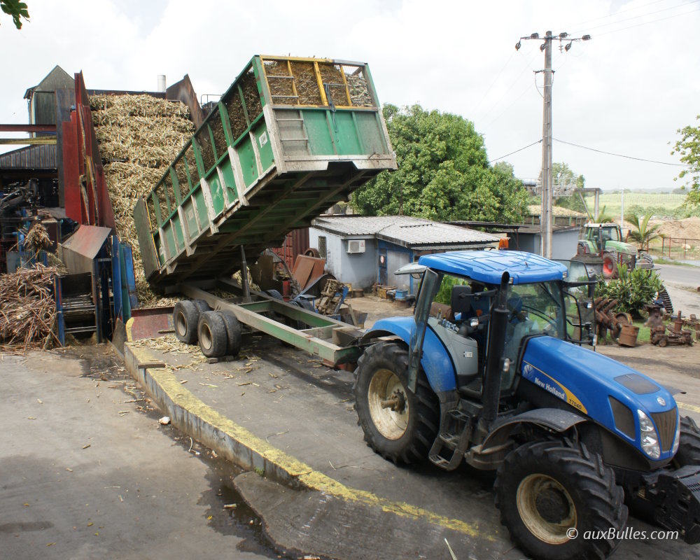Déchargement de la canne à sucre à la Distillerie Damoiseau située au Moule, en Guadeloupe, illustrant la transformation de la canne en rhum agricole