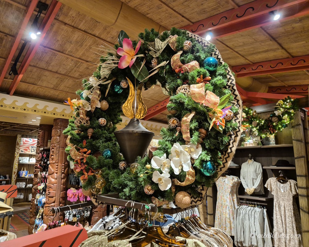 Reprenez le monorail en direction du Polynesian Village Resort, un autre hôtel à l'ambiance unique pendant les fêtes de Noël. Le décor tropical s'y marie parfaitement avec des touches de Noël exotiques, comme des guirlandes lumineuses et des décorations en coquillages. Le sapin de Noël, orné d'éléments évoquant les îles, crée une atmosphère chaleureuse et dépaysante, mêlant influences polynésiennes et traditions hivernales.