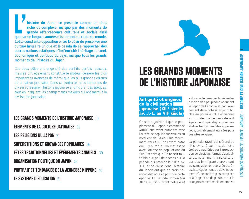 Une autre partie importante du guide s'intéresse au Japon moderne, entre tradition et innovation. Le livre aborde des thèmes comme l'organisation du travail, la vie urbaine, l'éducation, ainsi que les défis démographiques et économiques auxquels le pays fait face. Ces explications donnent un contexte utile pour comprendre le fonctionnement quotidien de la société japonaise.